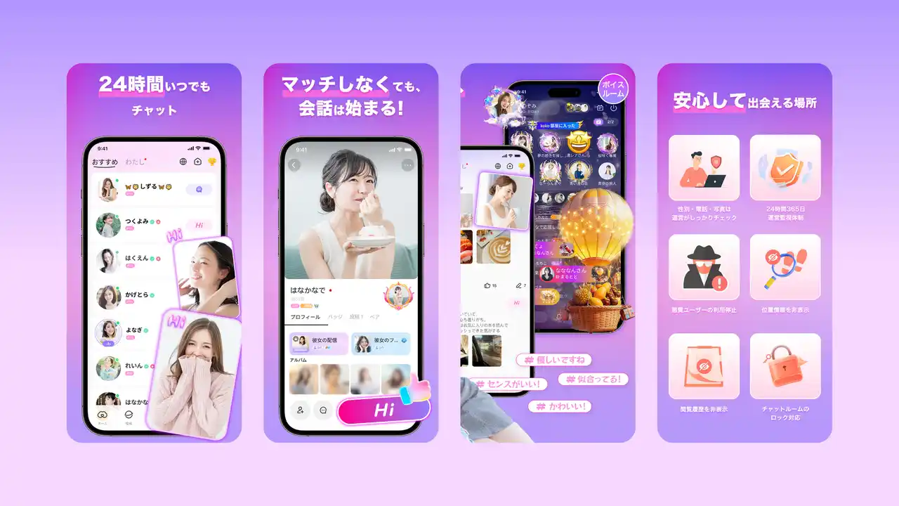 独自のレコメンドアルゴリズムとマッチング機能により、アプリを開いた瞬間に会話が始まる設計となっており、スワイプやマッチング待ちといった従来のプロセスを省くことで、気軽にコミュニケーションが取れる環境を実現しています。 |
