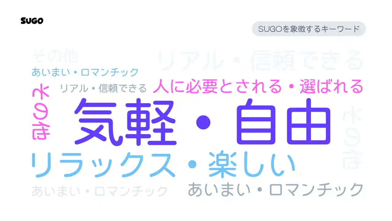アンケートでは、65%以上のユーザーがSUGOについて「気軽で、楽しく、自由度が高い」と回答しています。 |