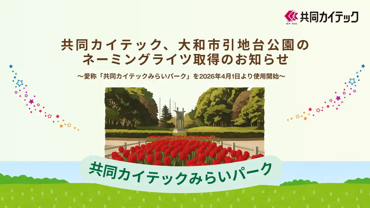 環境設備メーカーの共同カイテック株式会社(本社:東京都渋谷区、代表取締役社長:吉田 建、以下「当社」)は、神奈川県大和市が募集する引地台公園のネーミングライツスポンサーに応募し、審査を経て、同施設のネーミングライツを取得しましたのでお知らせいたします。 なお、愛称は 2026 年 4 月 1 日より使用開始いたします。 |