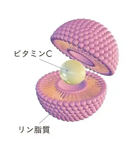 リポソームとは、リン脂質の二重膜構造を持つ球状のカプセルです。人の体と親和性の高いリン脂質でできたカプセルの内部に有用成分を閉じ込めることができます。そのため、リポソームビタミンCは、普通のビタミンCと比較して体内への吸収率が高いことが特長です。 |