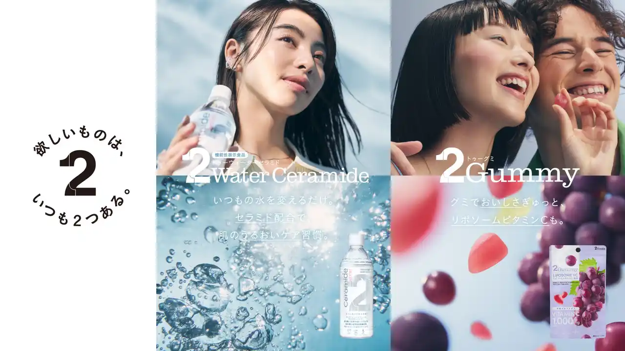 2foodsでは、"欲しいものは、いつも2つある。"というおいしさや健康・美容もわがままに叶えるブランドの精神から、いつもの間食や水分補給を変えるだけで、おいしく賢くインナーケアを叶えられるような商品を開発してまいりました。2025年3月に日本初のリポソームビタミンC配合グミ「2Gummy LIPOSOME VC」を発売、全国のコンビニエンスストアやバラエティショップ、ドラッグストアなどで展開し、2026年2月にはセラミド配合で"水分補給"と"肌のうるおいケア"を両立した機能性表示食品「2Water Ceramide」の販売を全国で開始するなど、インナーケアのラインナップを拡充しています。 |