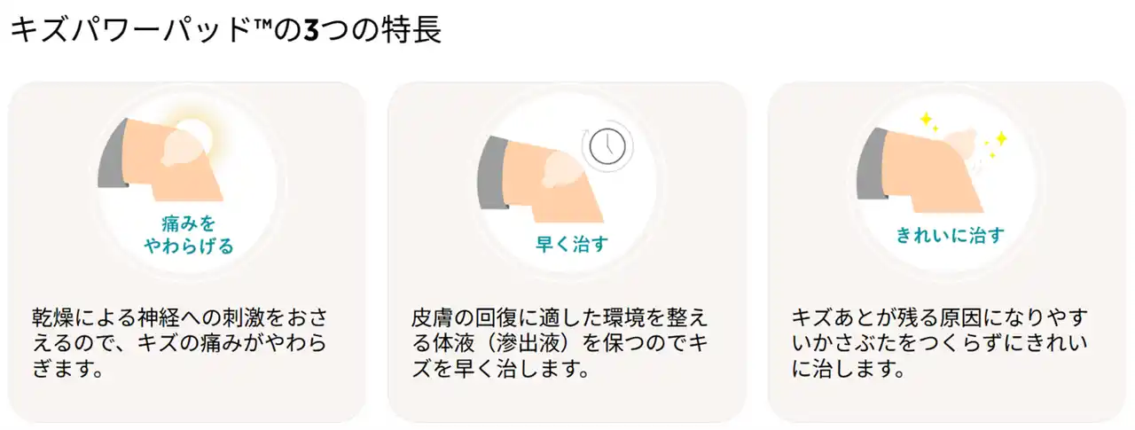 キズパワーパッド(TM)なら、そうしたキズの痛みもやわらげ、早くキレイに治します。 |