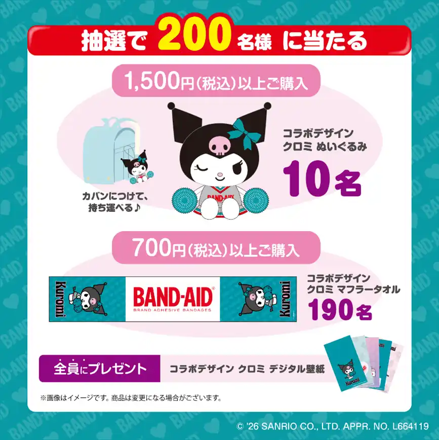 期間中に、日本国内の実店舗またはネット通販で対象商品をご購入ください。お買い上げレシート等の画像をキャンペーンサイトの応募フォームからアップロードし、必要事項をご入力のうえご応募いただくと、抽選で合計200名様に「バンドエイド(R) × サンリオキャラクター『クロミ』」限定グッズをプレゼントします。 |