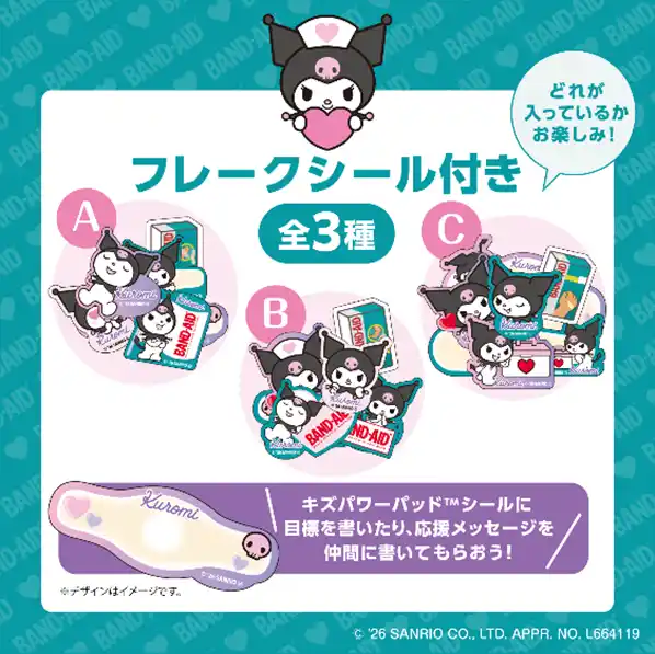 バンドエイド(R) × サンリオキャラクター「クロミ」限定パッケージには、全3種のフレークシールの中から、どれか1種(6枚入り)がランダムで入っています。どのシールに出会えるかは、開けてからのお楽しみです。 |