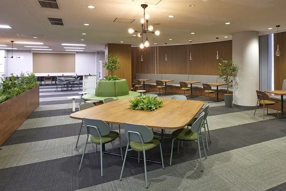 グリーンや温かみのある木目調の家具を配置。心地よく利用者が集いやすい内装デザイン。 |