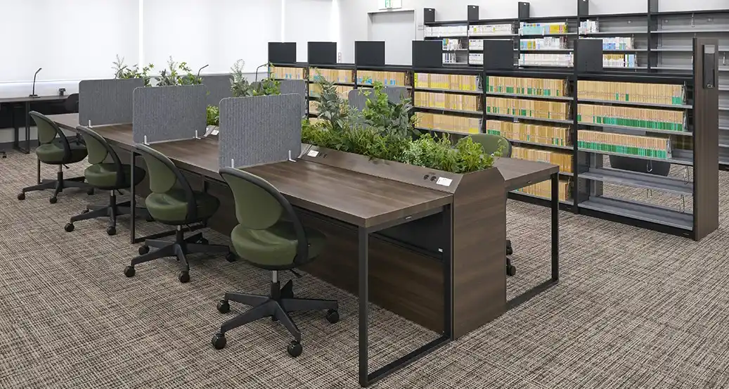 落ち着いたダークブラウンの家具を基調に、読書や学修に集中しやすい空間に。 |