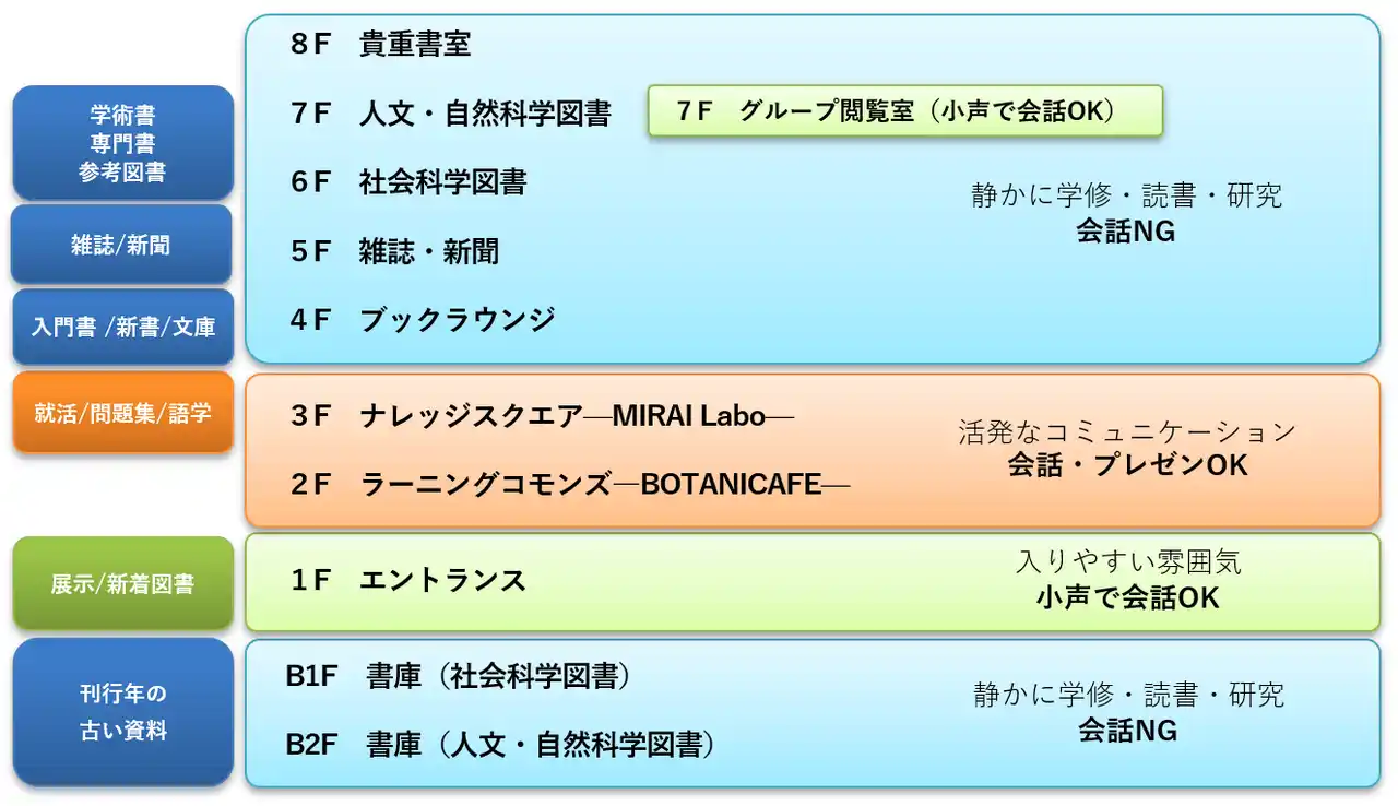 2025年4月にリニューアル済みの1Fフロアと、既存の他フロアも併せて全館的なゾーニングを行い、目的に応じて柔軟にフロアの使い分けができるようになりました。約67万冊の蔵書とオンラインリソースも活用し、学生・教職員の学びや研究をサポートします。 |