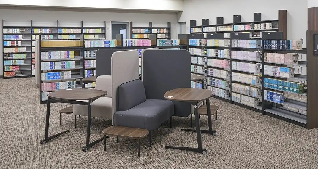 書架と椅子を有機的に組み合わせ、くつろぎながら気軽に図書館資料に触れられる空間へ。学生向けコレクション “亜大ラベル”や新書・文庫本などをリニューアル後のフロアに配置し、読書習慣の定着を狙う。 |