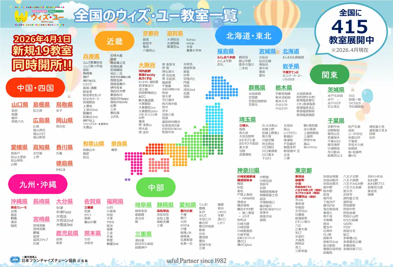 これにより「ウィズ・ユー」は全国415教室体制となり、発達支援領域における国内有数のネットワークへと拡大しました。 |