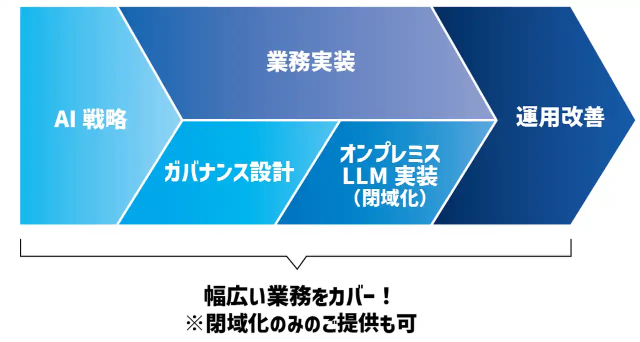 | ―金融・製造・医療など機密情報を扱う業界で加速するオンプレミスLLM需要に対応。戦略策定からインフラ構築・運用改善まで一気通貫で支援― |