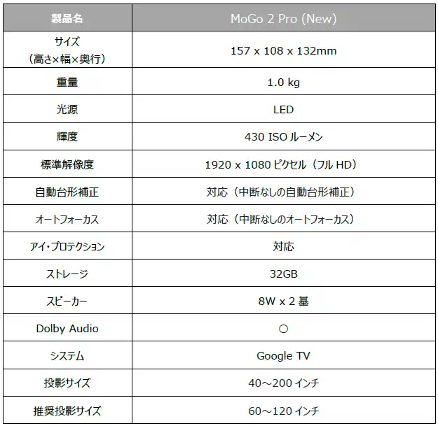 「MoGo 2 Pro (New)」は、従来モデルの使いやすさはそのままに、OSをGoogle TVにアップデート。Netflix、YouTube、Prime Video などの各種動画配信サービスに、よりスムーズにアクセスできるようになりました。 |