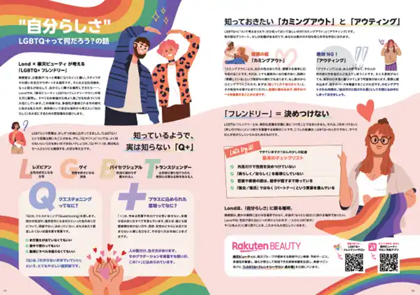 「LGBTQ+って何だろう?」をテーマに、多様な価値観や生き方に触れながら、“自分らしさ”を見つめ直すきっかけを提供します。 また、本特集では、美容サロン検索・予約サービス「Rakuten BEAUTY」(楽天グループ提供)の取り組みも紹介。多様性を尊重し、誰もが安心して利用できる美容体験の実現を目指し、美容サロン向けに「LGBTQ+フレンドリーサロンガイド(虎の巻)」を提供しています。 |