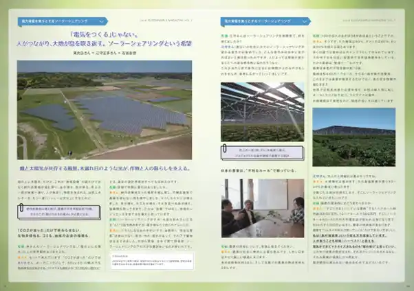 | 株式会社TERRA代表取締役 東光弘氏、東京大学 未来ビジョン研究センター教授 江守正多氏、株式会社Lond Holdings 代表 石田吉信氏による対談を掲載し、畑と太陽光発電が共存する風景をテーマに、持続可能なエネルギーと暮らしのあり方について語ります。再生可能エネルギーを通じた新しい社会の可能性を提示します。 | |||