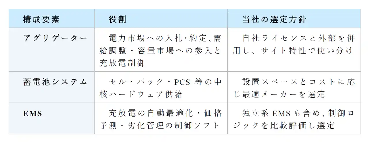 当社は、蓄電所ごとにアグリゲーター、蓄電池システム、EMSをそれぞれ独立して選定する方針を採用しています。系統用蓄電池事業は急速に発展する市場であり、技術革新やコスト低減のスピードは各領域で異なります。特定のパッケージソリューションに固定するのではなく、各要素を分離して最適なものを組み合わせることで、技術的優位性とコスト競争力の両立を目指します。 |