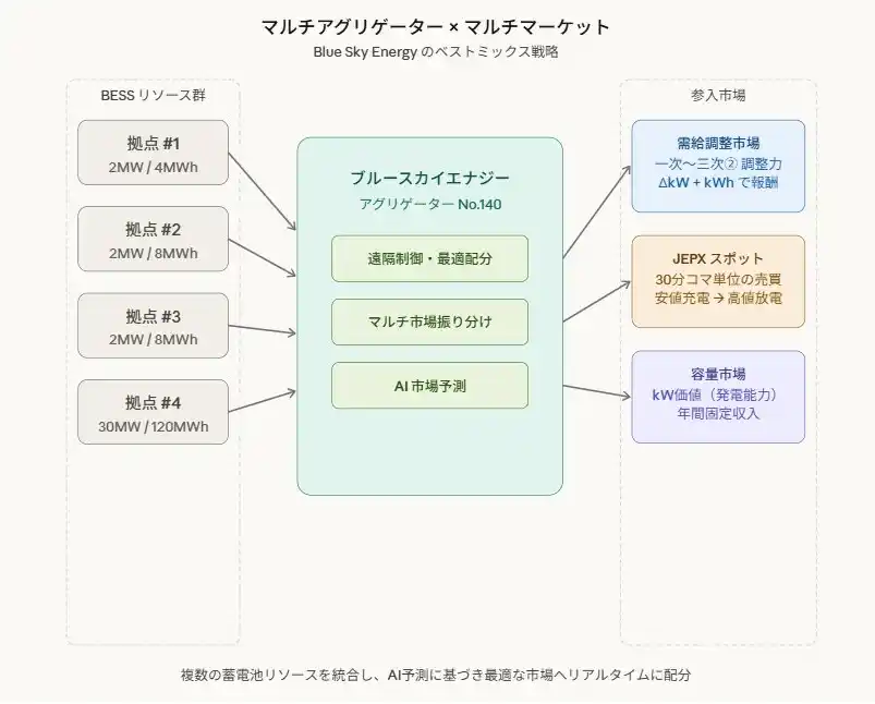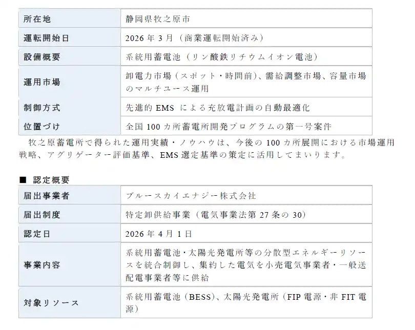 ブルースカイエナジー株式会社は電気事業法に基づき経済産業大臣へ特定卸供給事業制度※1に定められた特定卸供給事業者(アグリゲーター)※2の届出を行い、2026年4月1日付で認定されましたのでお知らせいたします。当社は2029年までに全国100カ所の系統用蓄電所の開発を計画しており、本年3月23日には静岡県牧之原市において第一号蓄電所の商業運転を開始いたしました。100カ所規模の蓄電所群を効率的かつ安定的に運用するためには、電力市場での取引執行・需給調整・系統運用を担うアグリゲーション機能が不可欠です。今般のアグリゲーターライセンス取得は、この大規模開発計画を支える事業基盤の強化として戦略的に推進したものです。 |