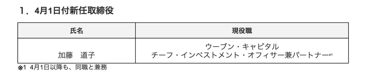 | トヨタ自動車株式会社の戦略投資子会社であるトヨタ・インベンション・パートナーズ株式会社(以下、TIP)は、本日4月1日付で近 健太が代表取締役CEOを退任し、その後任として加藤 道子が同職に就任したことをお知らせいたします。 | |||||||||