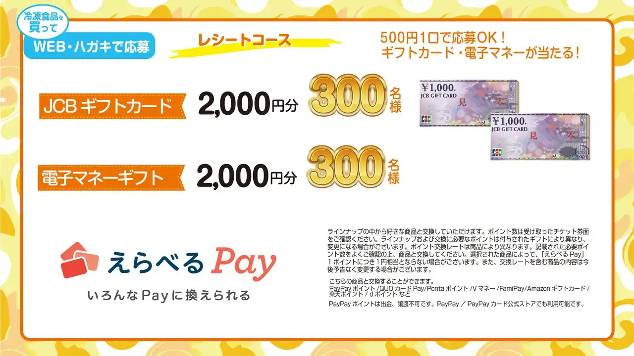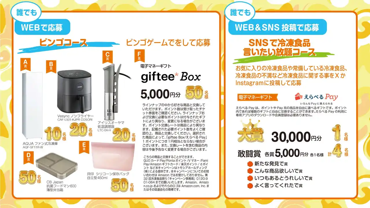 春の冷凍食品祭りは、冷凍食品のレシート500円1口で応募してJCBギフトカードまたはデジタルギフト「えらべるPay(R)️」2000円分が当たる『レシートコース』、ビンゴゲームに挑戦、応募してデジタルギフト「giftee Box(R)️」5000円分や、冷凍庫などの豪華家電製品や調理器具などが当たる『ビンゴコース』、お気に入りの冷凍食品や常備している冷凍食品、冷凍食品の不満など冷凍食品に関する事をXかInstagramに投稿して、大賞30,000円分、敢闘賞5,000円分のデジタルギフト「えらべるPay(R)️」が当たる『SNSで冷凍食品言いたい放題コース』の3コースあります。購入しても購入しなくても参加いただけます。その他「Wチャンス賞」もあり、抽選で合計1,305名様が当選するキャンペーンです。 |