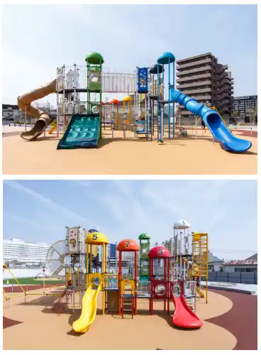 大型複合遊具「チータカタワー」は、最大約6.7mの高さを有し、5基のスライダーを備え、多くの子どもたちが同時に遊ぶことができます。また自転車を漕ぐとギアが回る仕掛けを取り入れることで、自転車の仕組みや漕ぐ楽しさを体験できる工夫を施しています。さらに複数のルートから登ることができる構造とすることで多様な動きで遊ぶことができ、飽きずに楽しめる遊具となっています。 |