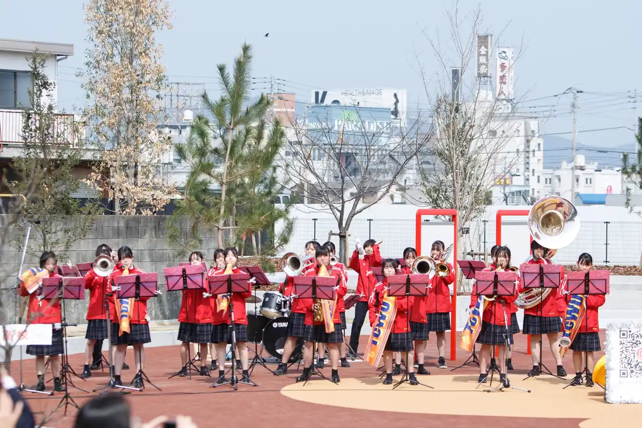 3月28日(土)にリニューアルを記念した落成式が開催されました。高松中央高校吹奏楽部の演奏で華やかに幕を開け、大西市長によるあいさつが行われました。その後来場者によるバルーンリリース、記念植樹や日本最大級のドローンショーを手がける「RED CLIFF(レッドクリフ)」によるスモークドローン(※)など、盛大な式典となりました。またサプライズとして、チータカ広場の建設に携わった関係者へ、高松中央幼稚園の子どもたちが手描きしたイラストで仕立てたメダルを、贈呈する演出も行われました。 |