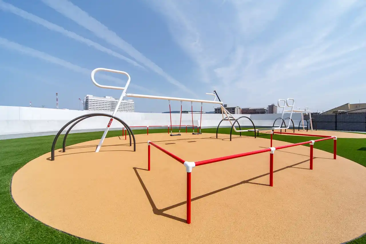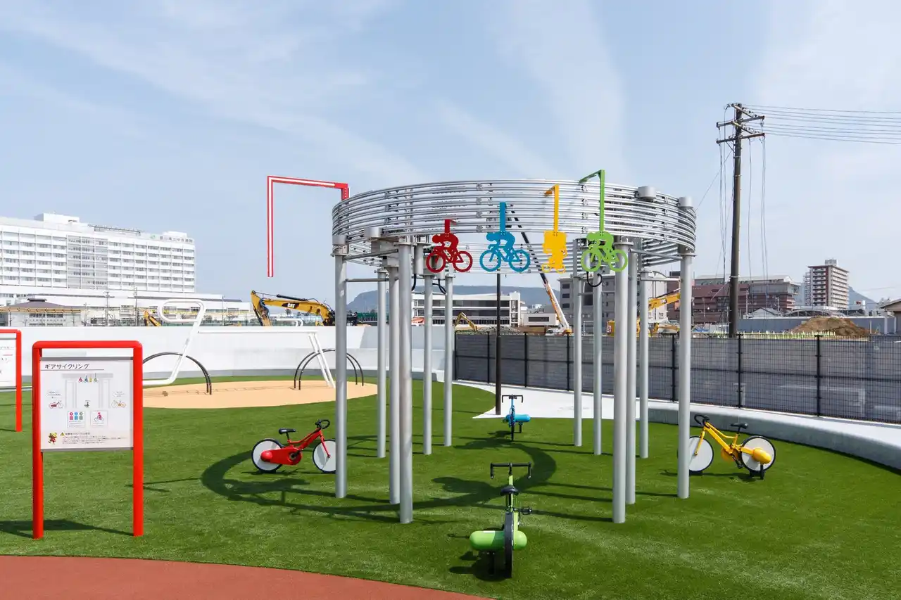 広場内には砂場やどんぐり拾いが楽しめる「いのちの森」などの多様な遊び場を整備し、子どもたちが自然と触れ合いながら遊べます。、さらに、自転車をモチーフとした大型複合遊具やペダルを漕ぐ楽しさを体感できる遊具などを通じて、子どもたちが楽しみながら自転車の魅力に触れられる空間となっています。 |
