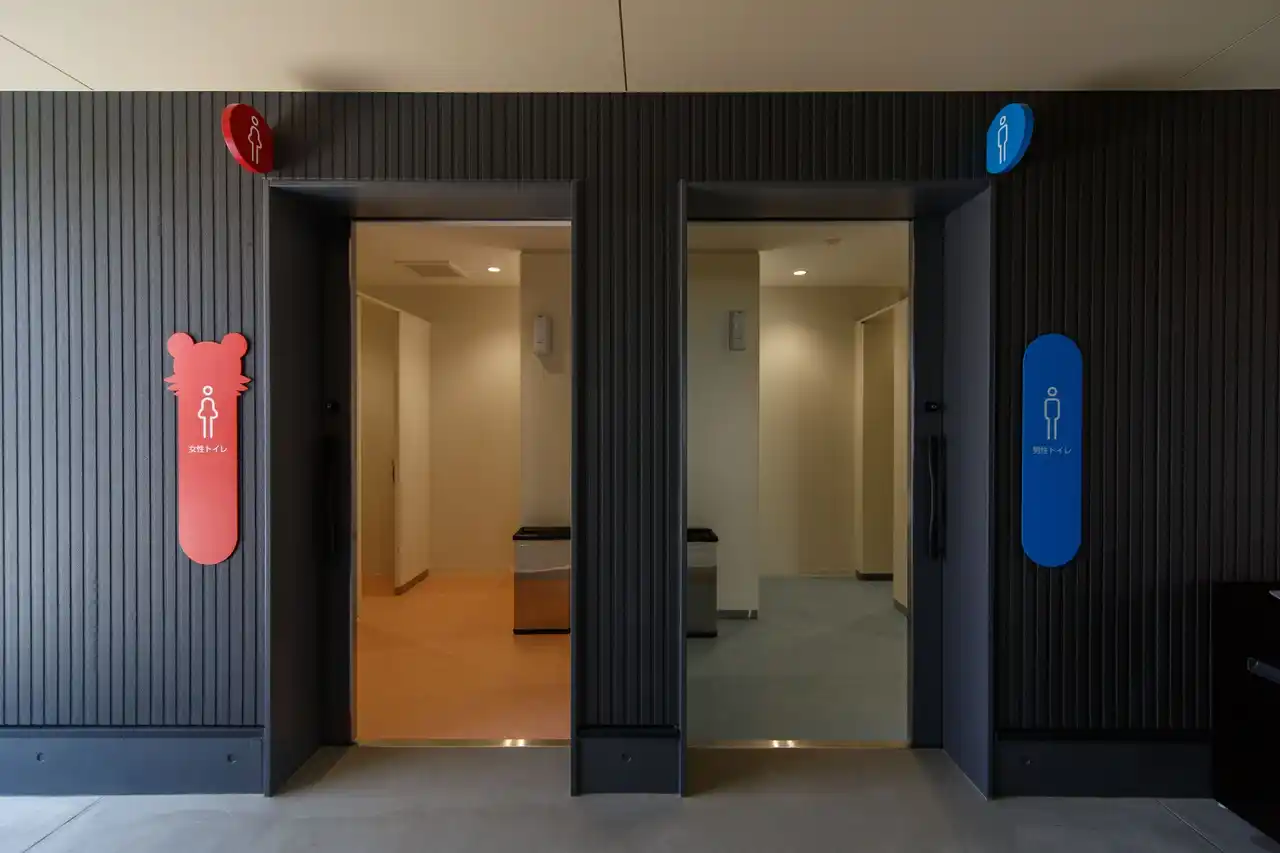 広場内にあるチータカハウスは、遊具エリア側には子どもたちの様子を見守ることができる屋根下広場を設けています。また、地域の方々が利用できるラウンジを配置しているほか、授乳室や多目的トイレも備えており、誰もが安心して利用しやすい環境を整えています。 |
