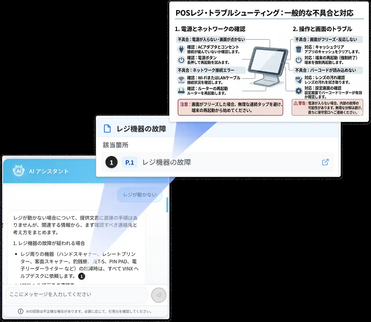 事前の面倒なシナリオ作成(想定Q&Aの登録)は一切不要です。 就業規則や店舗運営マニュアル、商品カタログなどをそのままシステムに投函(アップロード)するだけで、AIが自然言語で意図を理解します。 スタッフが質問すると、平均30秒で「マニュアルの該当ページ(根拠)」を添えて即答します。 |