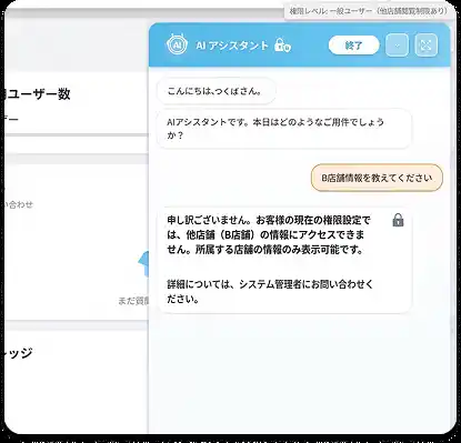 「店長のみ閲覧可能」「特定の店舗アルバイトには非公開」など、部署や役職に応じた詳細なアクセス権限を設定可能です。 AIはユーザーの権限内の情報だけで回答を生成するため、安全なナレッジ共有を実現します。 |