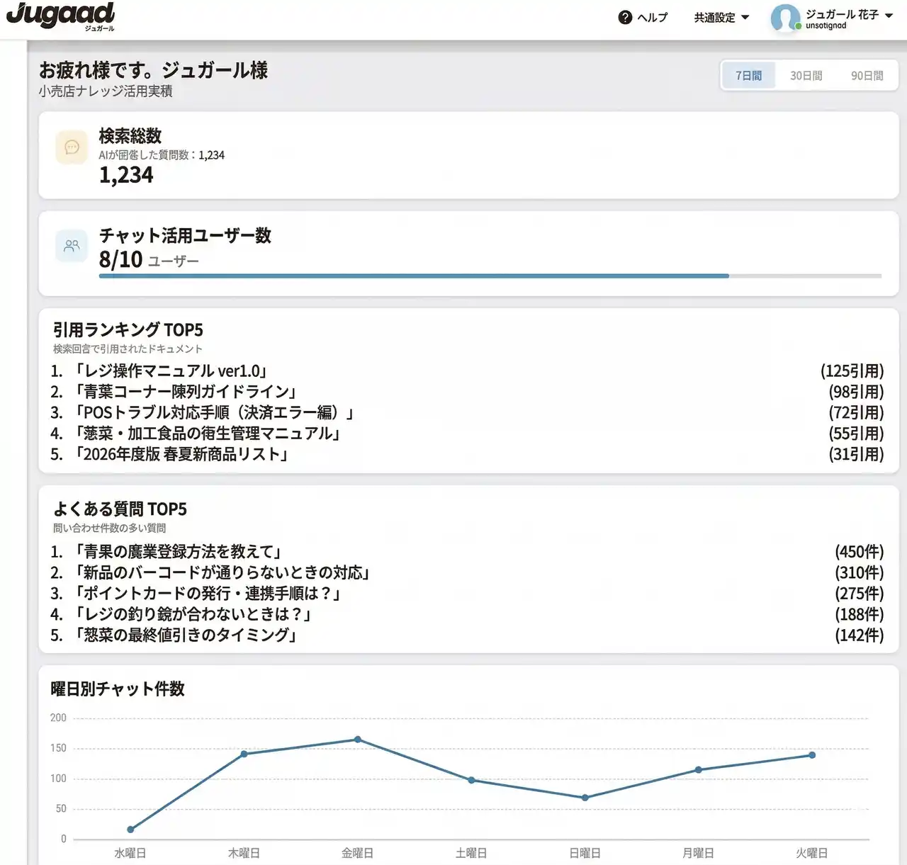 この構造的な課題を解決するためには、スタッフが先輩や店長に依存することなく、必要なルールや手順を「セルフサービス」で即座に見つけ、自己解決できる道のり(仕組み)が不可欠です。 大手小売企業様との長期にわたる実証実験を通じて、現場の実際の問いかけに対する「使い勝手」や「回答精度」を徹底的に向上させ、この度、単独のSaaSプロダクト「Jugaad AIナレッジ」として正式リリースする運びとなりました。 |