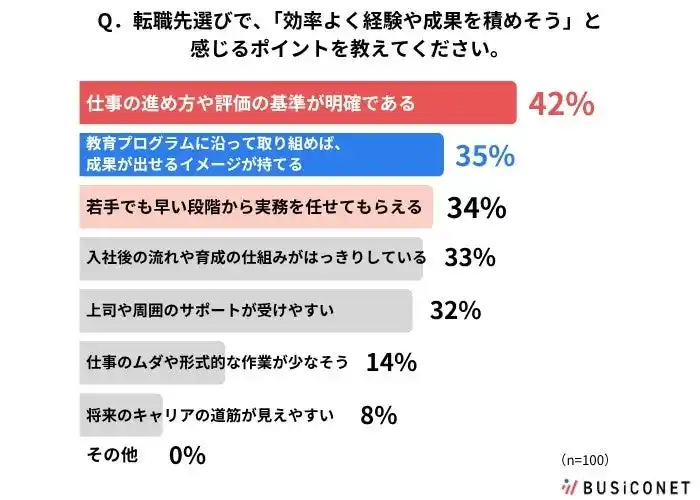 | 「Q.あなたが転職先を選ぶ際、「効率よく経験や成果を積めそう」と感じるポイントを教えてください。」という問いに対して、最も多かった回答が「仕事の進め方や評価の基準が明確である」で42%、次に「教育プログラムに沿って取り組めば、成果が出せるイメージが持てる」が35%、「若手でも早い段階から実務を任せてもらえる」が34%と続きます。 | |||||