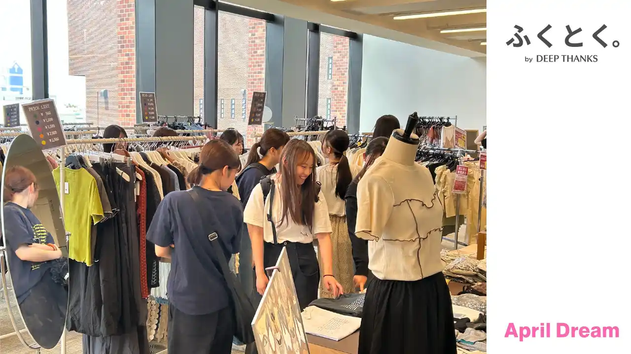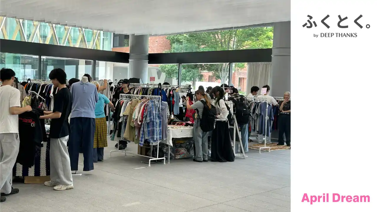 『ふくとく。』の起点となるのが、大学キャンパス内で開催される「ふくとくマーケット。」です。本マーケットは、大学という限定空間で実施するクローズマーケット方式を採用しています。アパレルブランドと共創し、廃棄予備軍となる在庫品を生活応援価格で提供することで、 |
