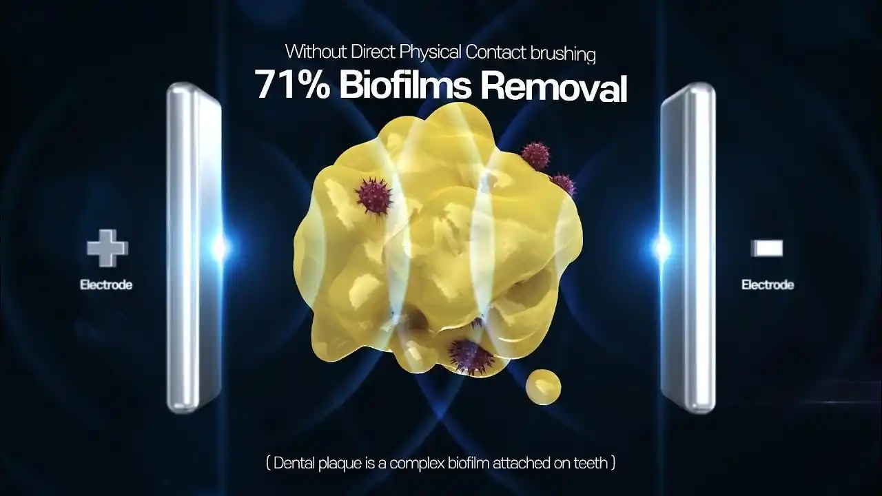 特徴:毎秒1,000万回(1,000万Hz) の微細電流で歯垢(バイオフィルム)を電子分離除去します。振動や刺激がないため、歯や歯茎への負担や損傷が少なく、矯正中やインプラント、歯周病ケアに最適です。歯垢や口臭の原因菌を科学的に抑制し本格的な歯周病ケアが可能。また歯茎を活性化し健康な状態に保ちます。 |