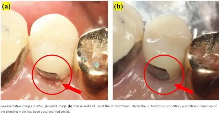 Nature学術誌掲載 臨床実験写真(4週間使用後 出血59%改善 プラーク67%減少) |
