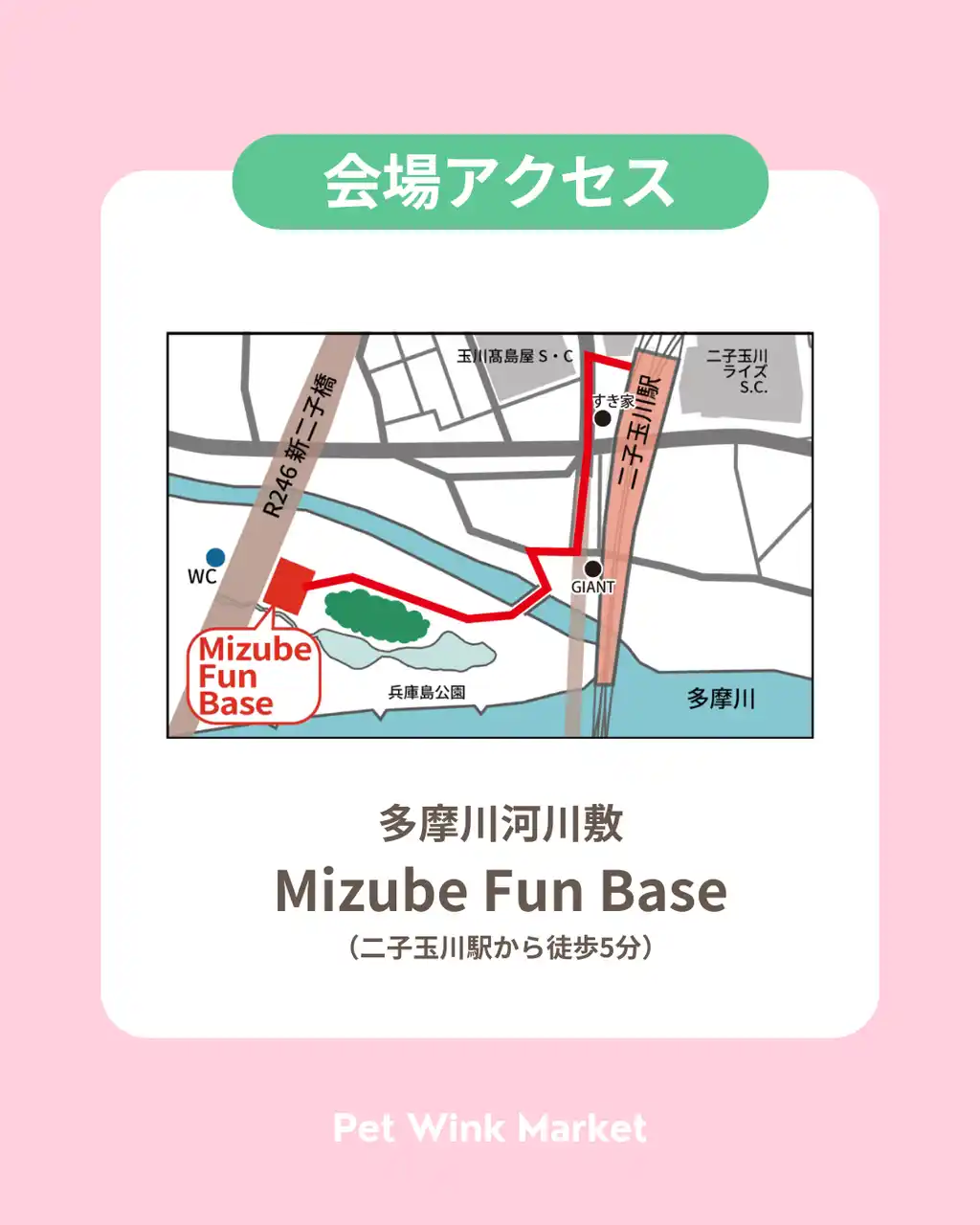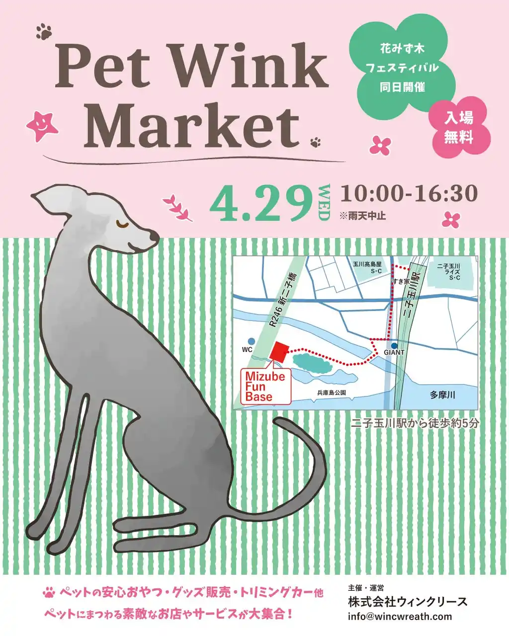 そんな特別な1日を過ごせる、ペットと一緒に楽しめるマーケットイベント『Pet Wink Market(ペットウィンクマーケット)』を、2026年4月29日(水・祝)、二子玉川の多摩川河川敷「Mizube Fun Base」にて開催いたします。 |