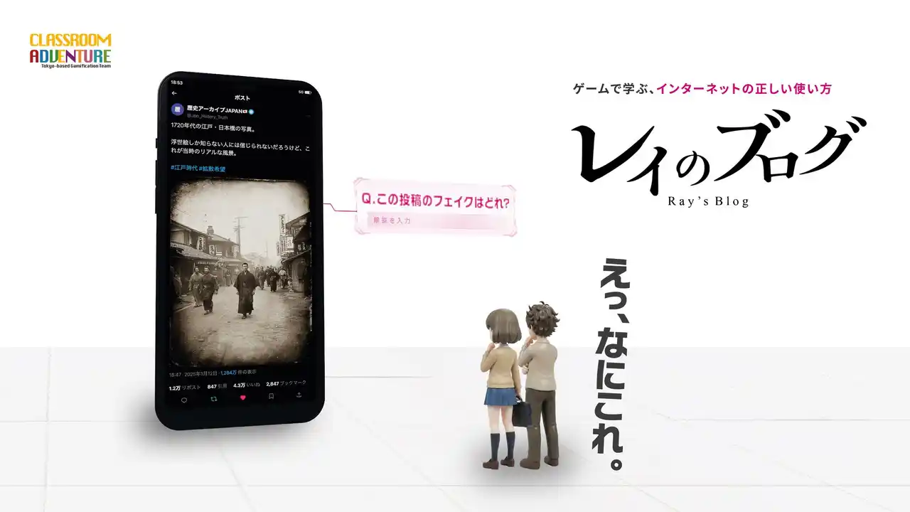 株式会社Classroom Adventure(代表取締役:今井善太郎)は、一般社団法人インターネットメディア協会(JIMA)が主催する「Internet Media Awards 2026」において、ゲーム型メディア・リテラシープログラム「レイのブログ -謎解きで学ぶ情報リテラシー」が、ソーシャルアクション部門を受賞しました。。Internet Media Awards 2026では、2025年中に公開・注目されたコンテンツや活動を対象に審査が行われ、「レイのブログ」は、フェイクニュースやデマへの対策・教育など、社会課題の解決にインパクトをもたらした作品や活動を対象とするソーシャルアクション部門で選出されました。 |