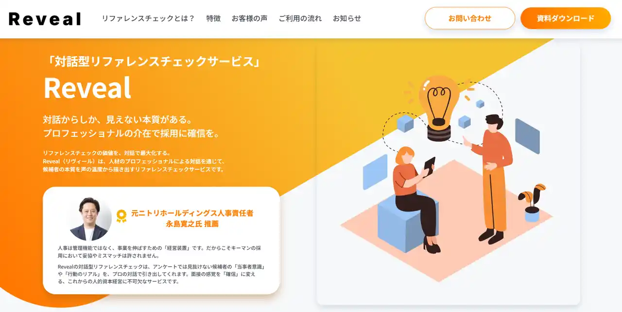 Revealは、プロフェッショナルによる対話を通じて候補者の本質に迫る「対話型リファレンスチェックサービス」です。 |