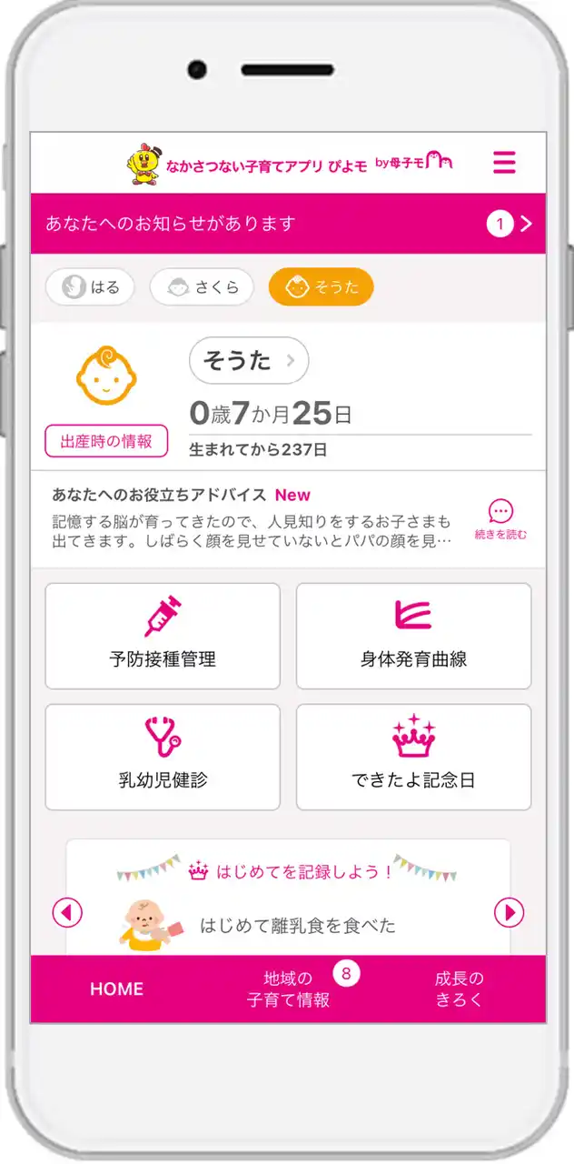 中札内村に採用された『なかさつない子育てアプリ ぴよモ』は、スマートフォン・タブレット端末・PCに対応したサービスで、妊産婦と子どもの健康データの記録・管理や予防接種のスケジュール管理、出産・育児に関するアドバイスの提供、離れた地域に住む祖父母など家族との共有機能や、村が配信する地域の情報をお知らせするなど、育児や仕事に忙しい母親や父親を助けてくれる便利な機能が充実しています。 育児日記として使用できる「できたよ記念日」は、こども家庭庁の母子健康手帳様式例などを元に作成し、母子健康手帳の「保護者の記録」を含む発達段階や子育てにかかわる記念日を写真やメッセージと共に記録できるだけでなく、子どもの成長・発達の目安としての役割も備えています。 また、感染症などの影響により社会的に環境変化が起こった際にも、アプリを通じて自治体からの注意情報や保健師からのアドバイスといった大切な情報をテキストや動画で必要な人に即時に届けることができるなど、非常時においても安心して出産・子育てができる環境づくりをサポートします。 |