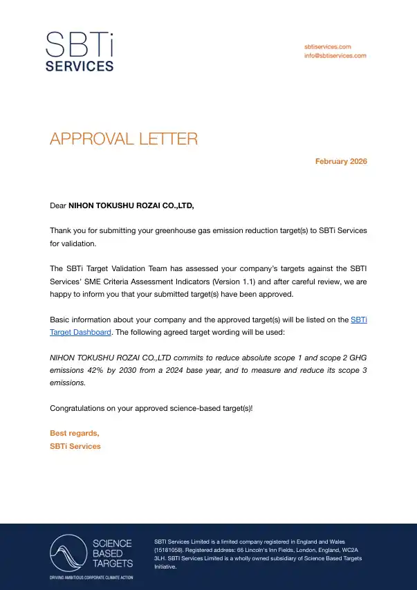 この度、本サービスを通じて日本特殊炉材株式会社(以下「同社」という)がGHGプロトコル(※2)にもとづき自社の温室効果ガス排出量となるScope1、Scope2(※3)を算定し、掲げた削減目標がSBT(※4)認定(中小企業向け)を取得しましたのでお知らせします。 |