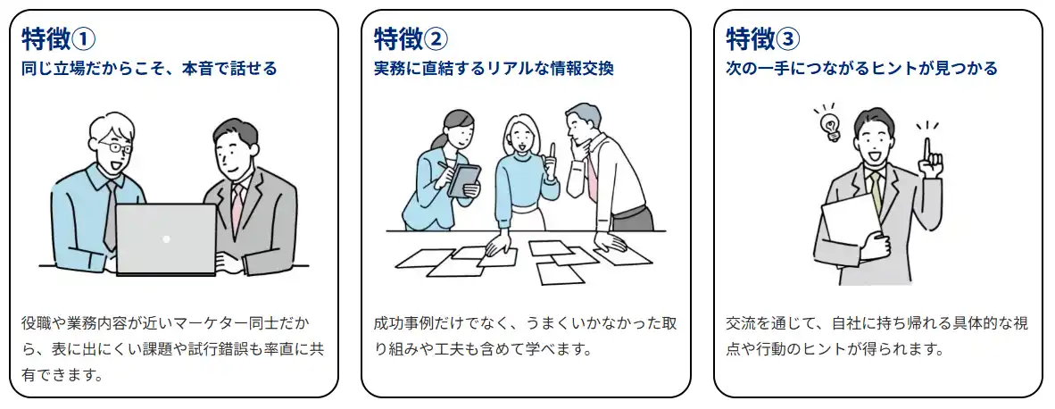 | 本交流会では、同じ立場のマーケター同士がリアルな課題や工夫を共有し、“次の一手”につながるヒントを得ることができます。 | ||||||||||||||