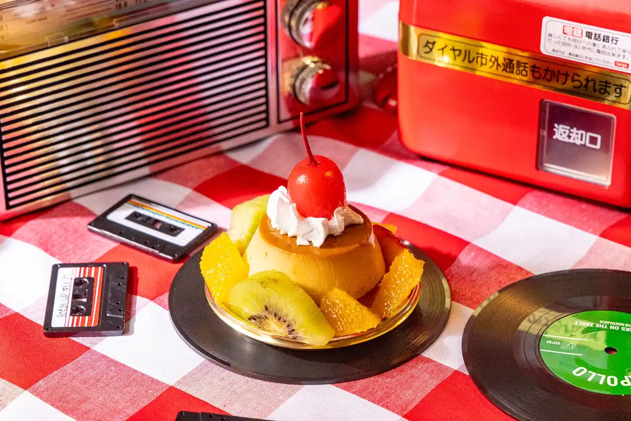 喫茶店の定番として親しまれてきたプリンアラモードを、愛らしいサイズでご用意しました。卵、牛乳、砂糖、バニラペーストで仕上げた、しっかりとした食感のクラシックなカスタードプリンに、キウイやオレンジ、いちごを彩りよく添えています。ホイップクリームとさくらんぼをあしらい、どこか懐かしさを感じる一品です。 |