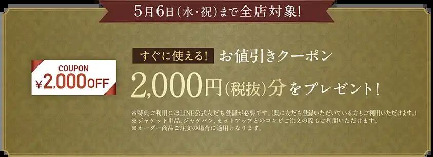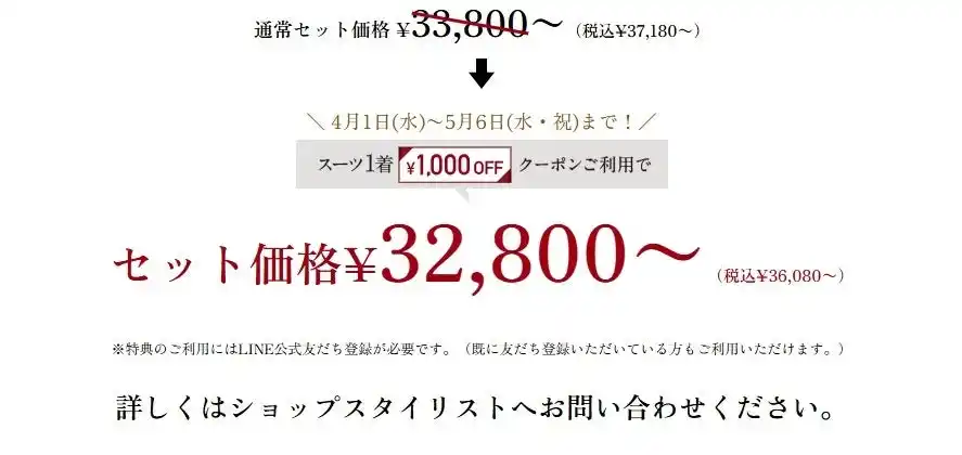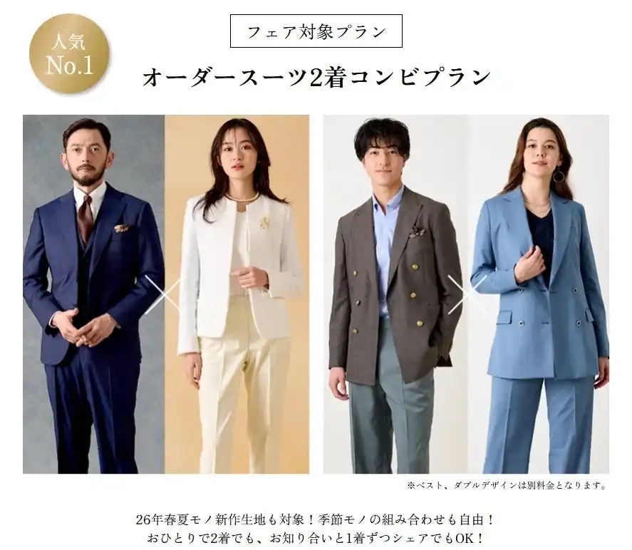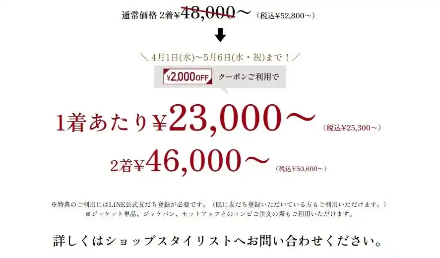 クーポンのご利用で本格オーダースーツが1着あたり23,000円~(税込25,300円~)ご購入いただけます。フェアは本日4月1日(水)から5月6日(水・祝)までの期間限定、全店舗対象です。 |