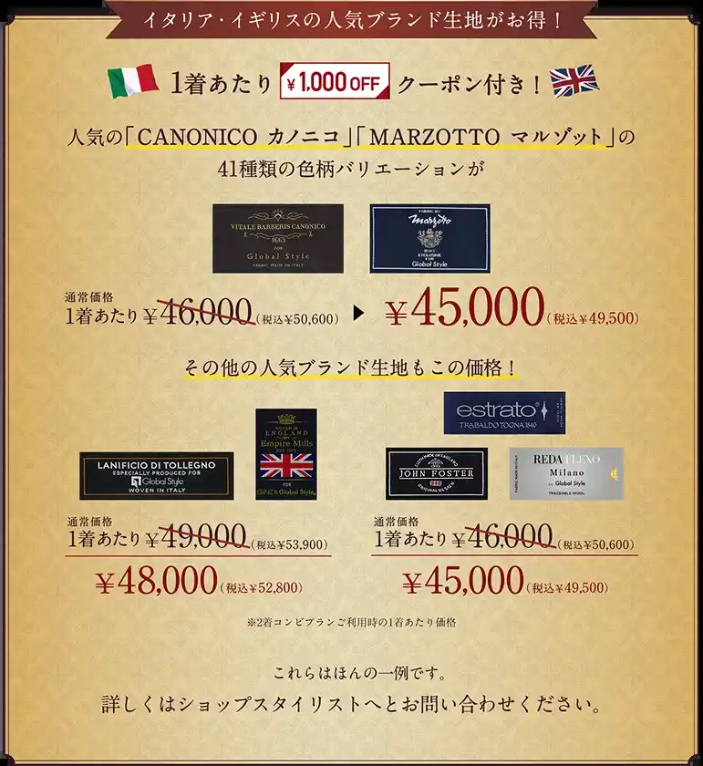 【今ならイタリア・イギリスの人気ブランド生地もお得!】 |