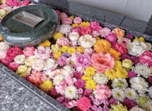 お線香の代わりに、色とりどりの生花を水盤に浮かべる「花供養」を採用。重々しい雰囲気ではなく、明るく清々しい空間で大切な家族を偲ぶことができます。 |