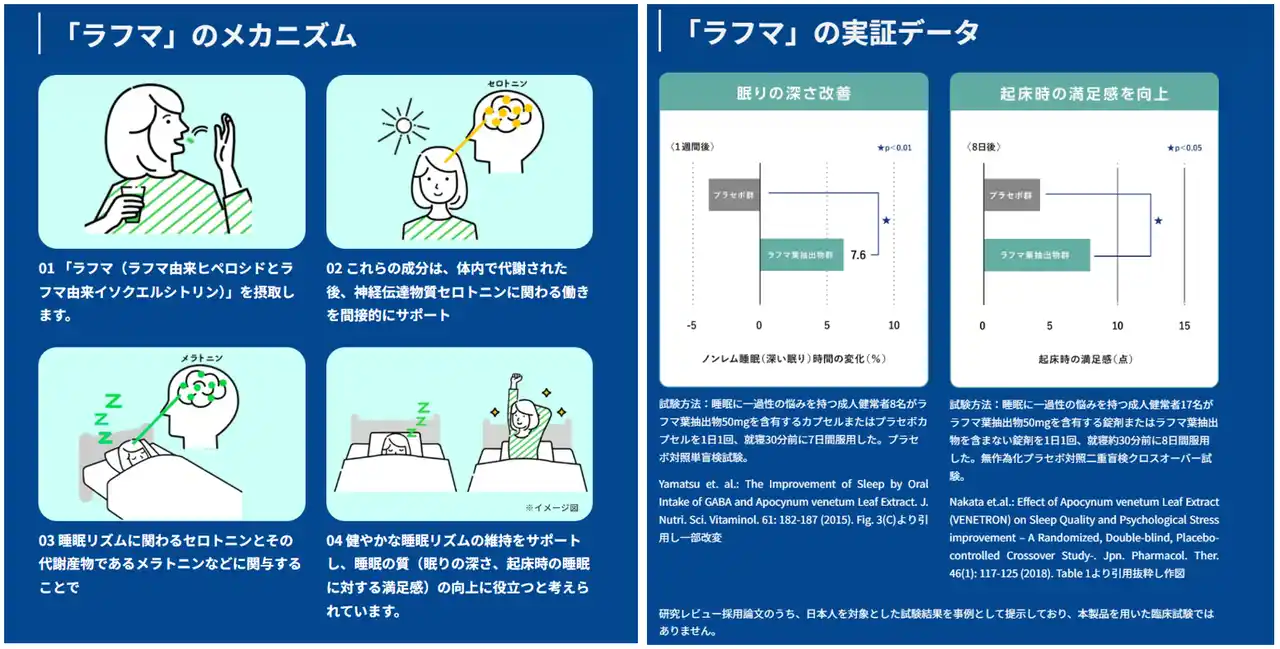 機能性関与成分として、ラフマ由来ヒペロシドとラフマ由来イソクエルシトリンの2つの植物由来の成分が含まれています。 |