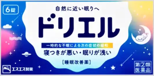 ドリエル、ドリエルEXは、全国の薬局・ドラッグストアでご購入いただける睡眠改善薬です。「寝つきが悪い」、「眠りが浅い」といった多くの現代人の抱える一時的な不眠症状※を緩和することで、生活全体を充実させQOL(Quality of life:生活の質)の向上に貢献いたします。病院で処方される睡眠薬(ベンゾジアゼピン系など)とは異なり、ドリエル、ドリエルEXはOTC医薬品のかぜ薬や鼻炎薬などに含まれる抗ヒスタミン剤の一種、ジフェンヒドラミン塩酸塩を配合しており、その作用で一時的な不眠症状を緩和します。 |