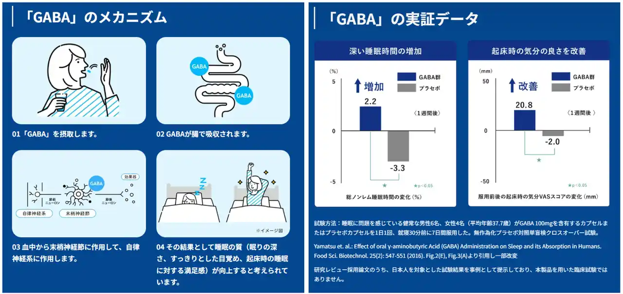 機能性表示:本品にはGABAとラフマ由来ヒペロシド、ラフマ由来イソクエルシトリンが含まれています。GABAには睡眠の質(眠りの深さ、すっきりとした目覚め)の向上に役立つ機能、日常生活で生じる一時的な活気・活力感の低下を軽減する機能があることが報告されています。ラフマ由来ヒペロシド、ラフマ由来イソクエルシトリンには睡眠の質(眠りの深さ・起床時の睡眠に対する満足感)の向上に役立つ機能があることが報告されています。 |