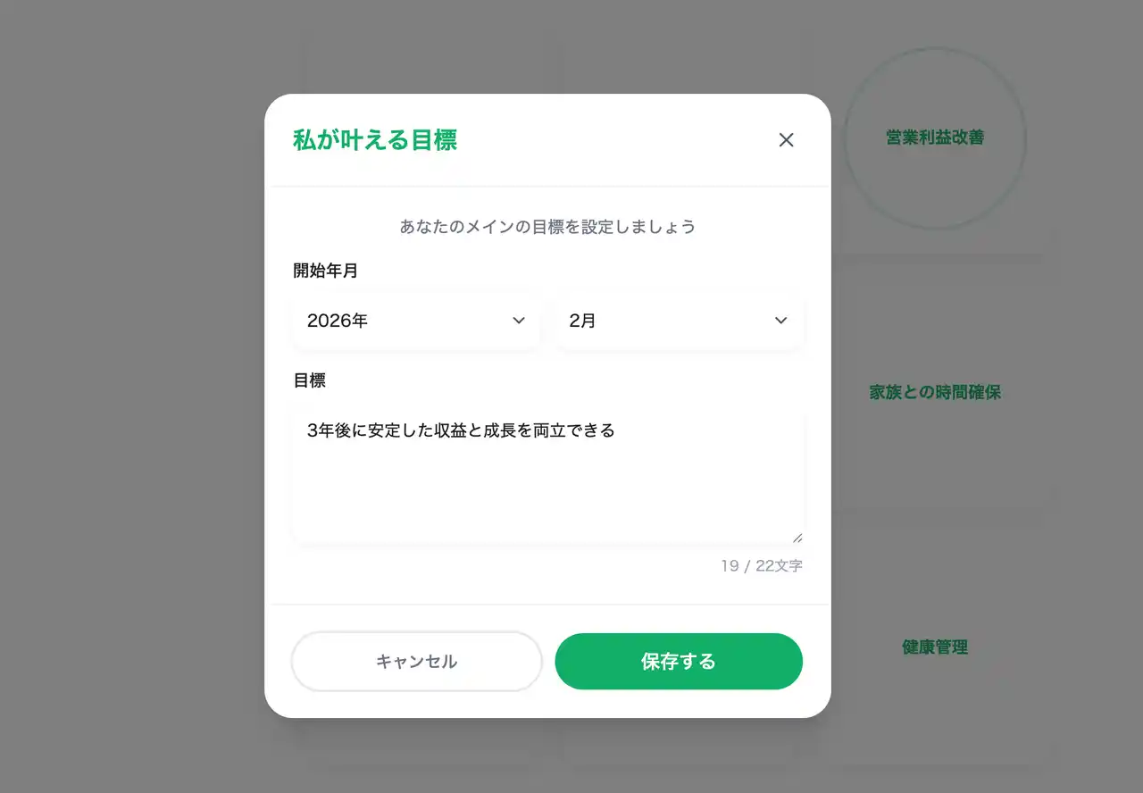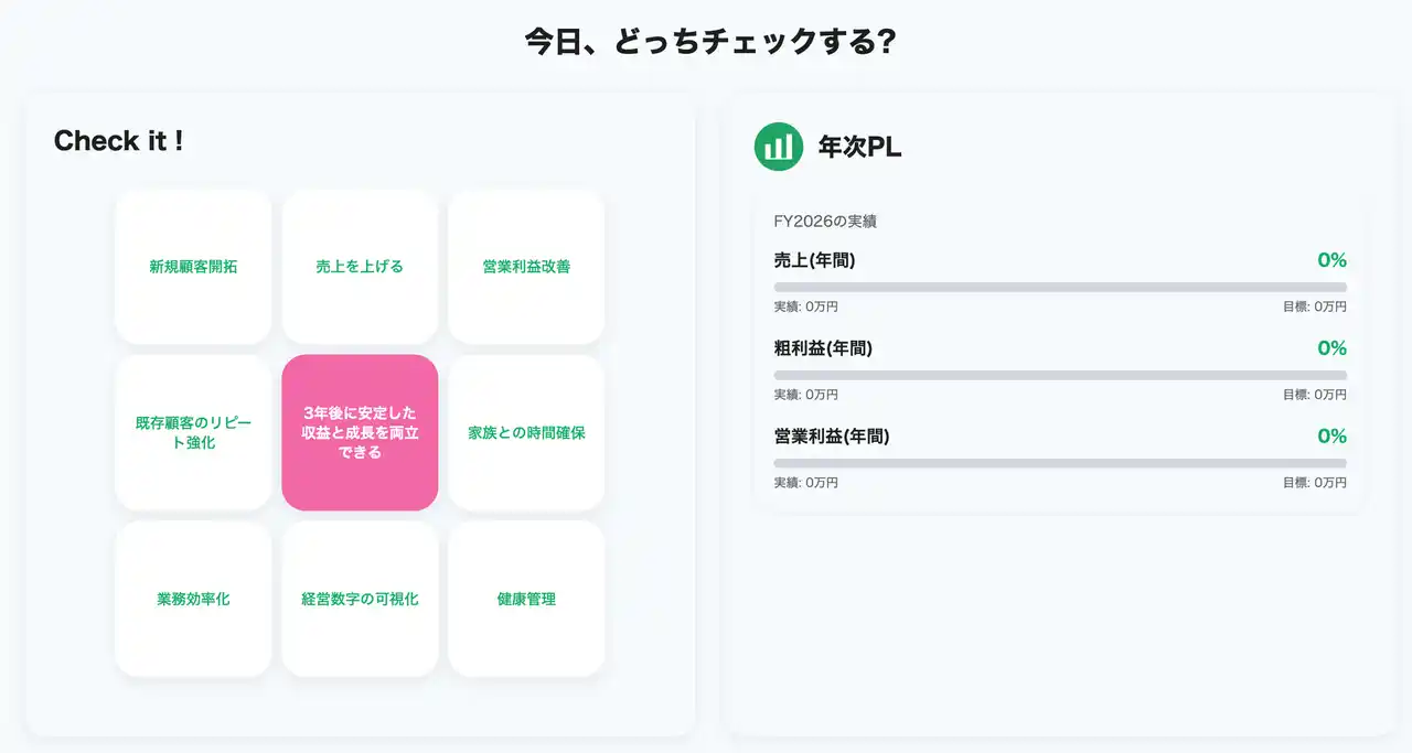 「自己実現(やりたいこと)」と「業績(きちんと稼ぐこと)」を同時に追えるよう、マンダラチャートを用いた目標設定と日々のPL管理を1つのアプリに統合。言葉やイメージを大切にしながら、抵抗感なく数字に向き合うことができます。 |
