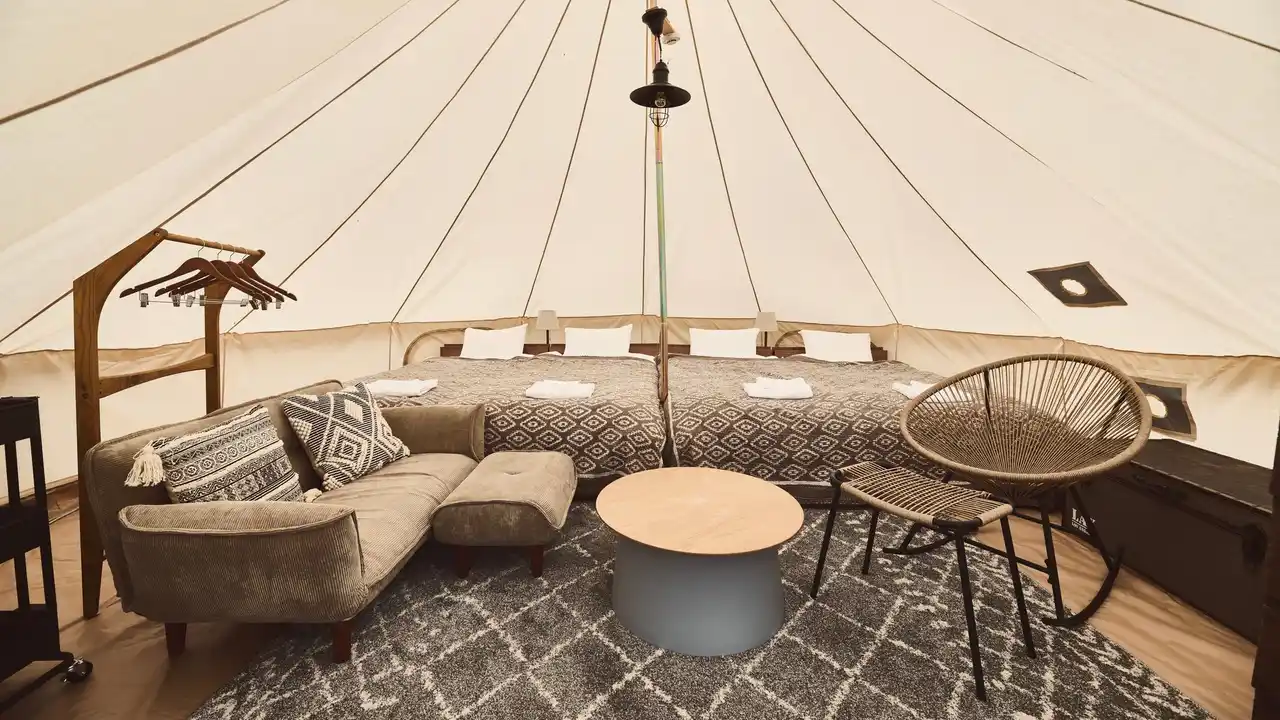 28平米のコットンベルテント(写真はシングルベッド4台タイプ) |