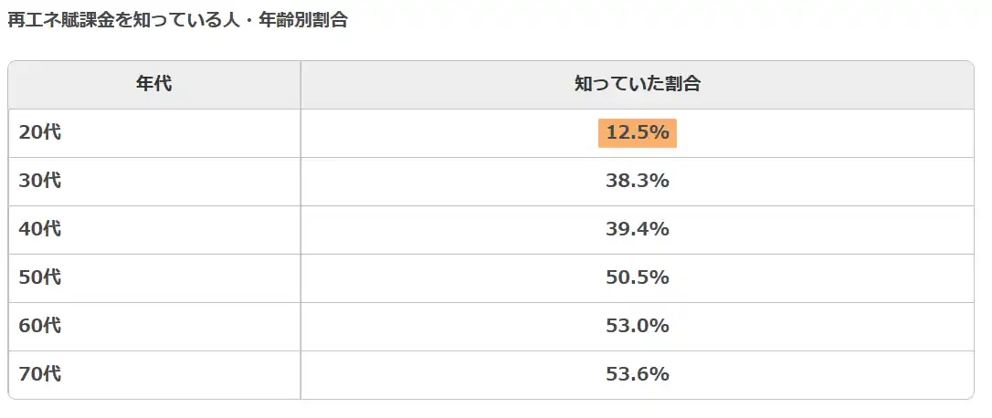 再エネ賦課金の認知度20代はわずか12.5%、30代、40代でも約40% |