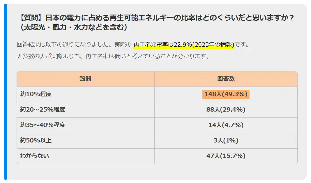 一方、 アンケート回答で最も多かったのが「10%程度」でした。この結果を見ると、 一般的な認識よりも日本の再エネ率は高まっていることが分かります。 |