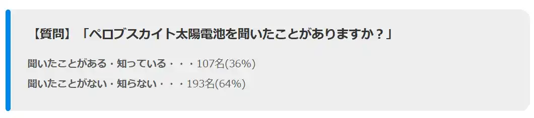 「ペロブスカイト太陽電池を聞いたことがあるか?」という質問に、あると回答したのは36%でした。「ない」と答えた人の半数以下ではありますが、この36%は無視できない数字といえます。 |